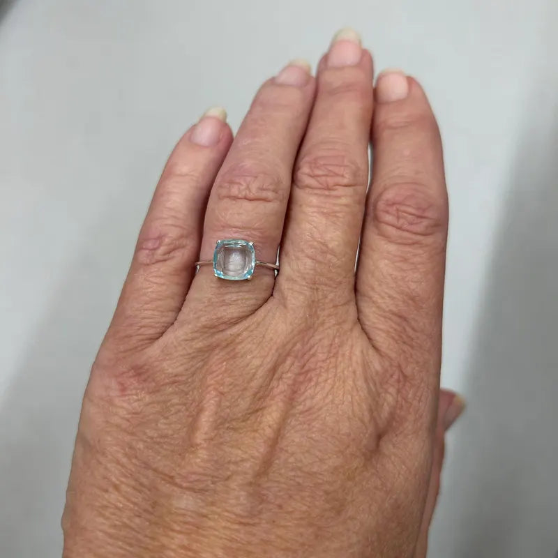 This gorgeous ring exceeded my expectations! The beautiful tablet cut aquamarine is a clear, pale blue. It sparkles and is prettier than the picture. The setting is dainty but seems strong and well made. It looks great alone or stacked with other rings. The shipping was so fast. I will definitely purchase from this shop again.