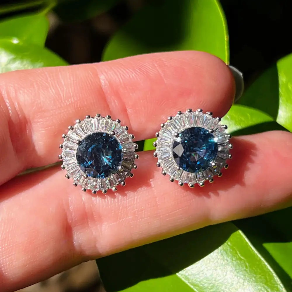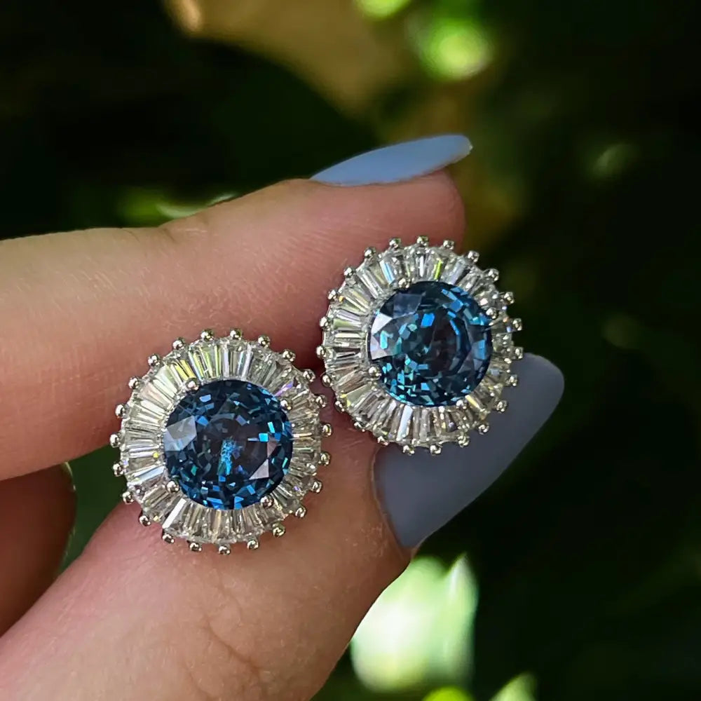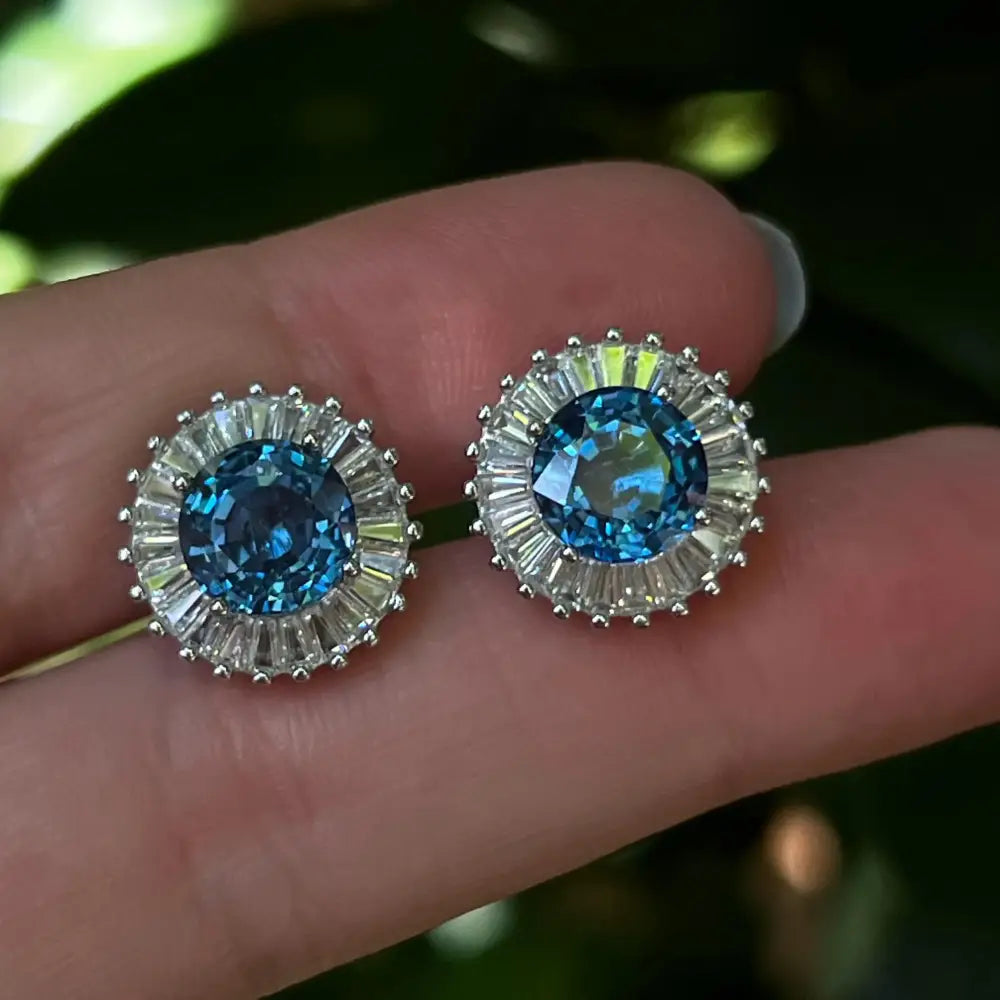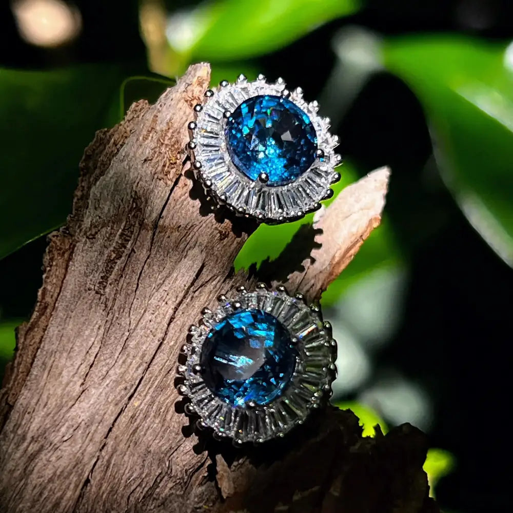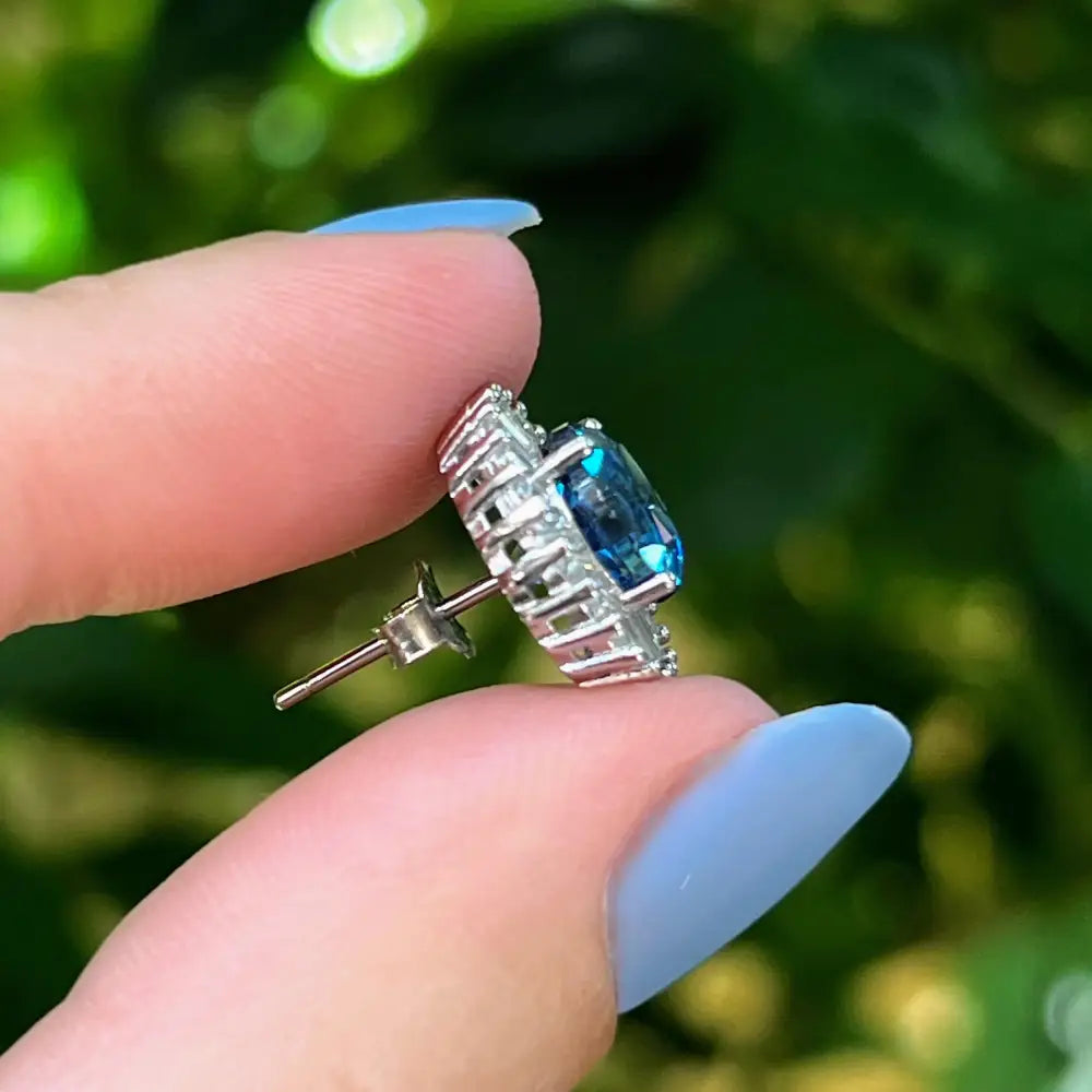 - Each earring is handcrafted out of a custom 8mm brilliant cut blue topaz gemstone.