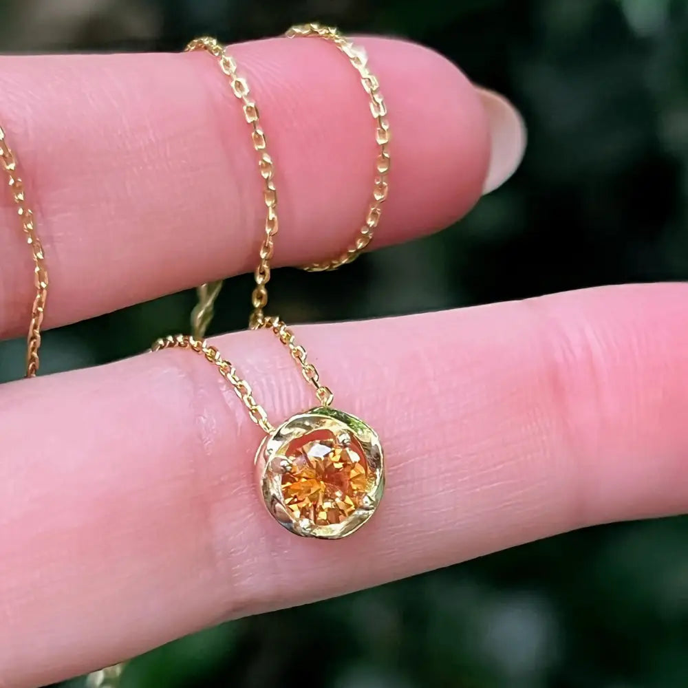 - Each necklace is handcrafted out of a 6mm round brilliant cut citrine, surrounded by a swirled solid halo.
